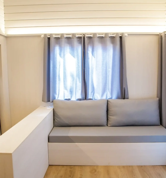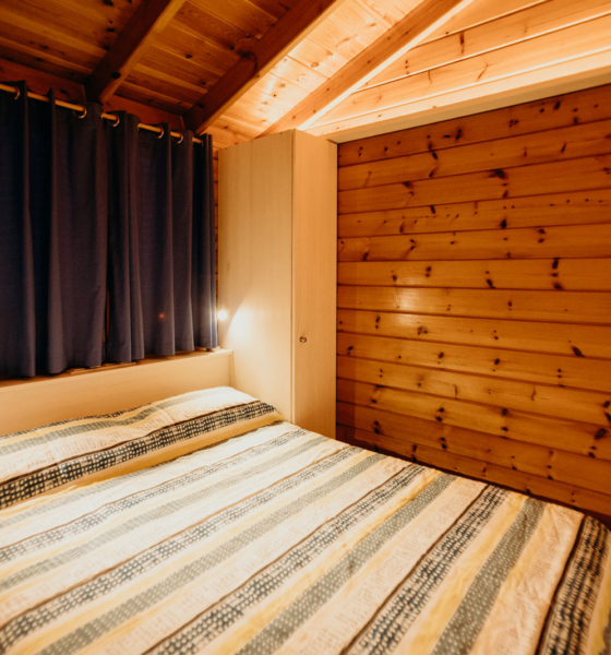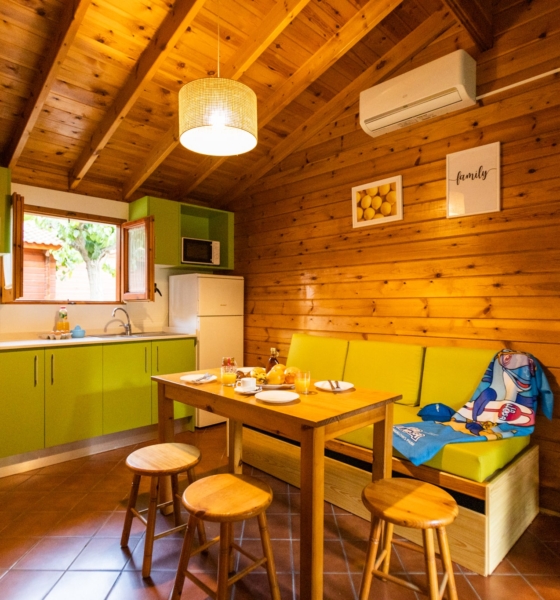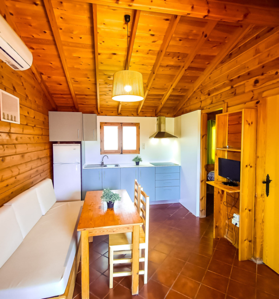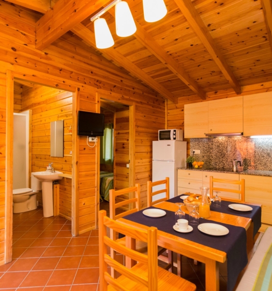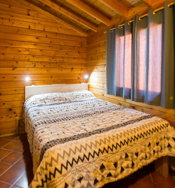 Bungalow de madera con 1 habitación de matrimonio y sofá, ideal para una pareja o familias con 1 0 2 niños menores de 9 años.