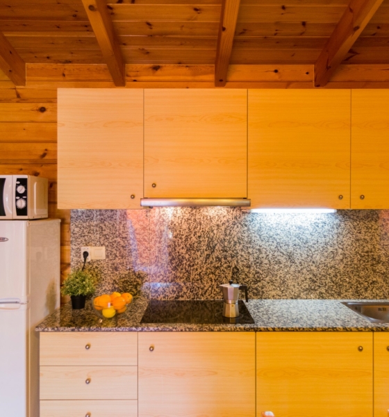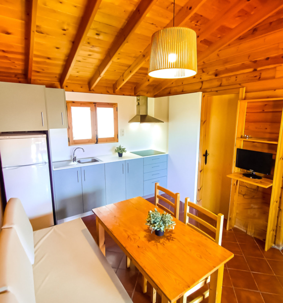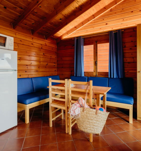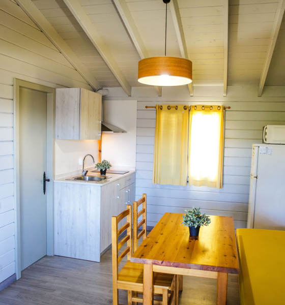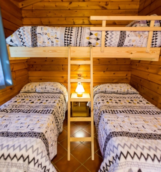 Bungalow de madera, dispone de 2 plantas. En la planta inferior tiene una habitación de matrimonio, sofá, cocina, el baño y la terraza; En la planta superior hay una cama doble y una individual. Ideal para familias.