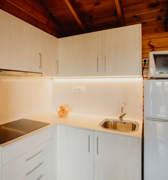 - Cocina equipada con menaje básico, nevera, cafetera de filtro eléctrica, batería de cocina, vitroceramica y microondas.